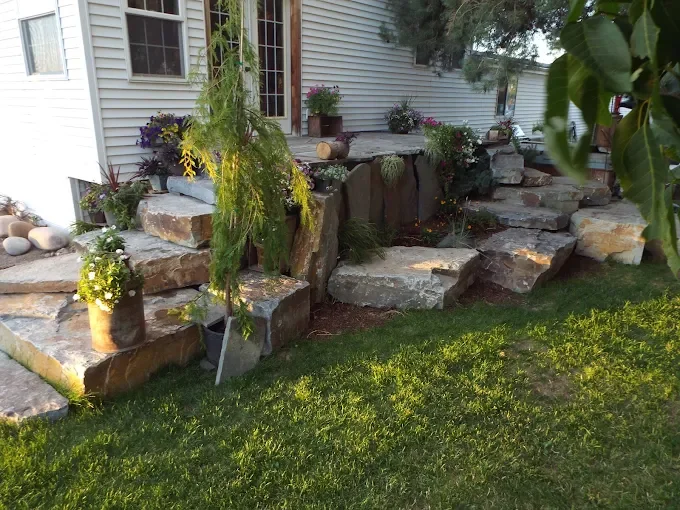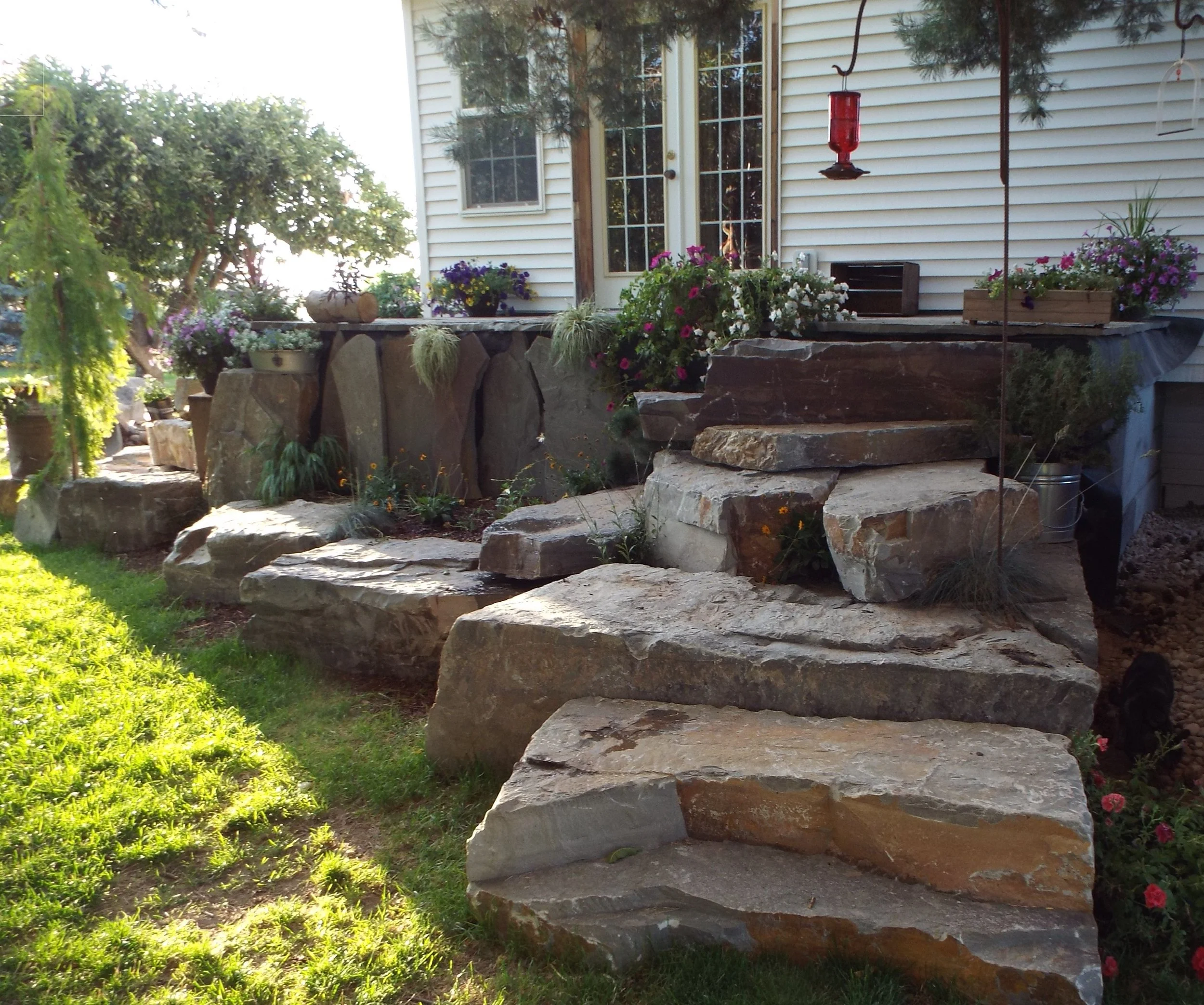 Landscaped front yard with tiered stone retaining walls and green plants in front of a house with a wooden front door.